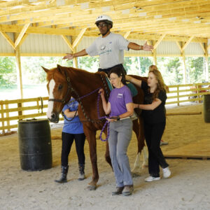 The camp is special because all the horses at HorsePower are trained therapeutic horses. A rider stays with the same horse for the duration of the camp. The cadence of the horse can help produce speech and core strength for a person.